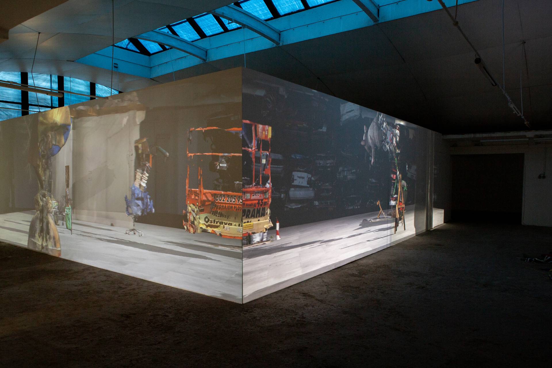 Found objects from the space and its vicinity become search prompts for a corresponding suite of virtual memory objects that attempt to turn the gallery inside out, the terminal point of a collection that spirals outward into the world. Stracke set out to scan particular things that set forth such memory triggers. Particular objects found inside and outside the gallery relate to recreation, locomotion and labor. Used furniture, tools, cars and fragments of entire house facades are placed on a slowly rotating virtual platform, where they are joined by a collection of associated objects in a perpetual call and response. Soothing and Moving is an examination of associative memory, which becomes a neural collagist perpetually creating networks and interrelations. Memory as a construction site reveals the inevitable compulsion to create and recognize patterns from which discourse and reality are formed
